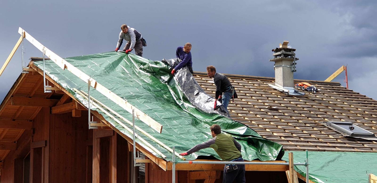 Intervention avec deux équipes, soit entre 6 et 8 charpentiers dès que le toit est découvert. Cela pour réduire le temps pour la mise hors d’eau. Le bâchage de la toiture est réalisé à chaque fin de journée pour vous rassurer.