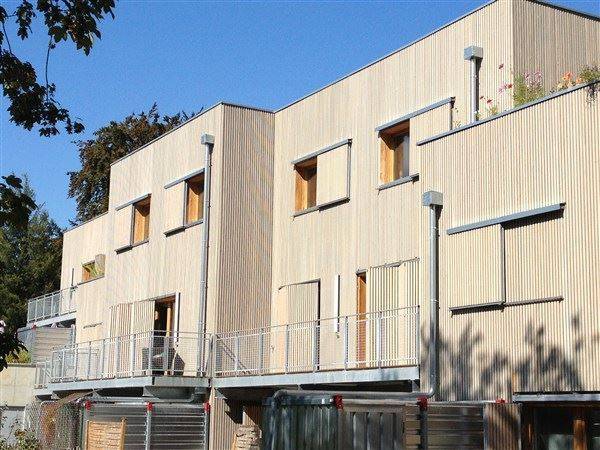 Cet ensemble de 10 appartements est réalisé en béton avec une enveloppe composée d’un doublage extérieur en bois, avec une isolation de 160mm en fibre de bois, que recouvre un bardage en carrelets de mélèze.