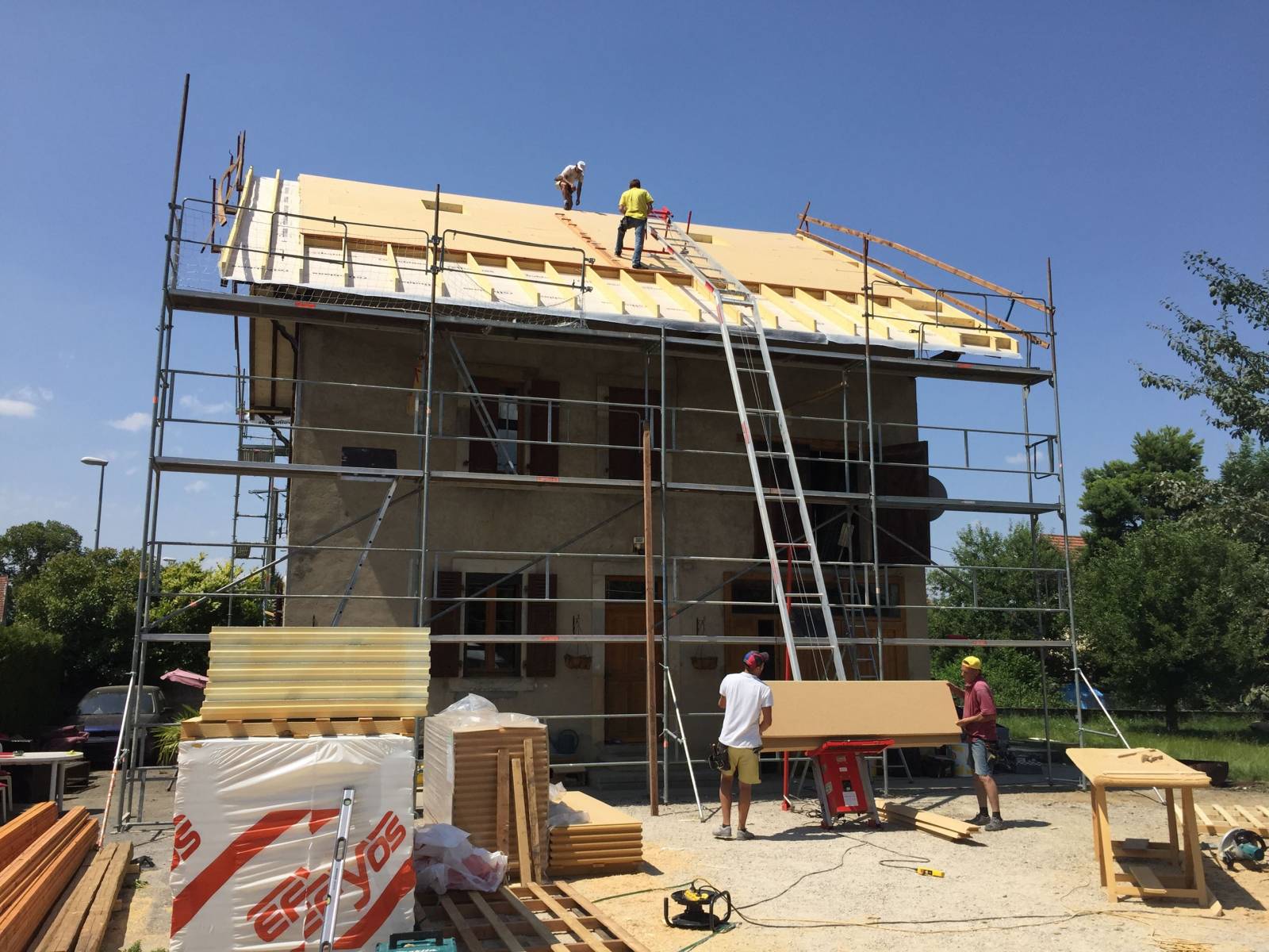 Préparation avec vous autour de la maison pour la mise en place du chantier, validons les détails avec notre conducteur de travaux : Velux, couleur des rives et tuiles….