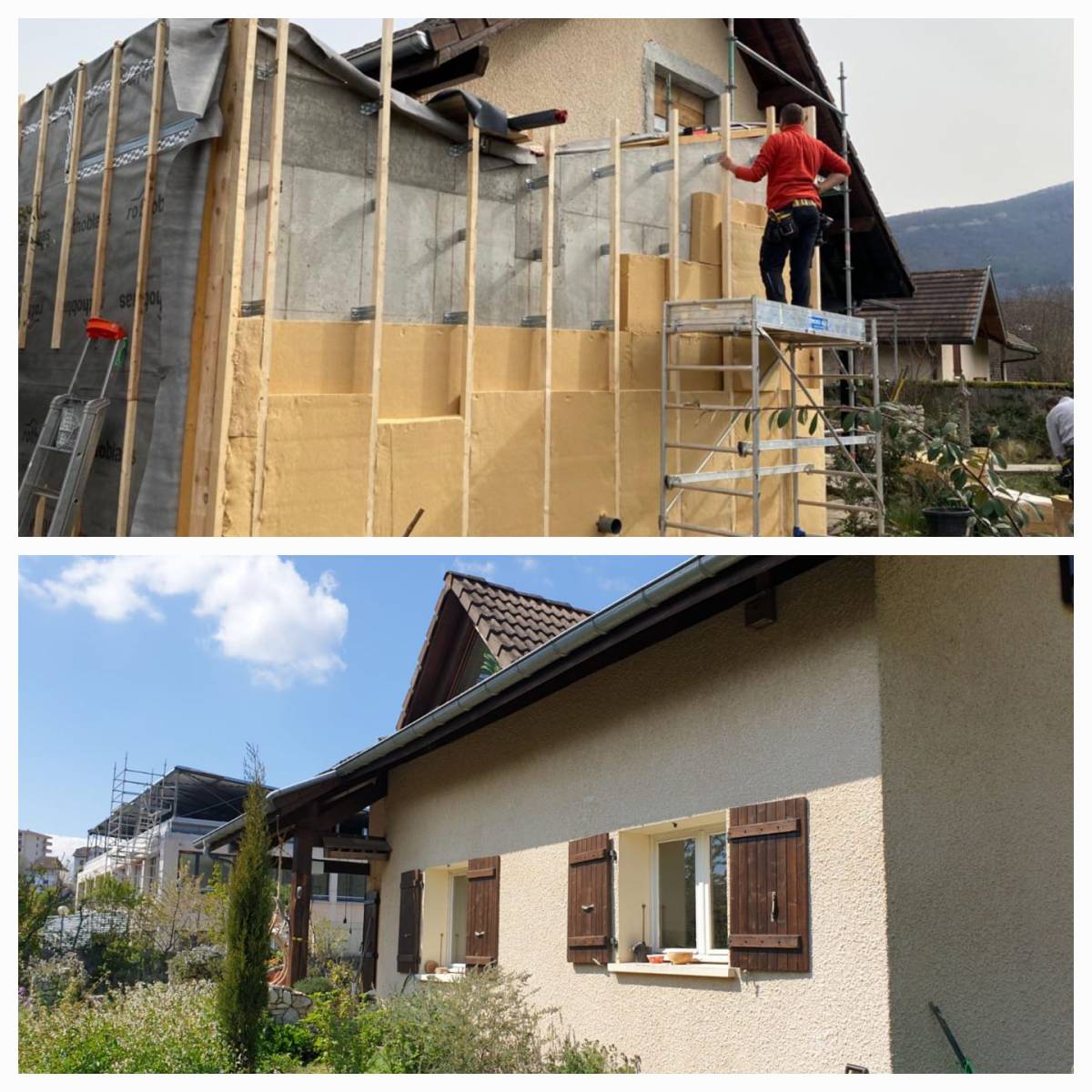 Les photos montrent l’évolution des travaux vers un chalet bois. Les balcons et terrasses en mélèze ont été développés autour de la maison. Une toiture neuve avec une sous toiture montgne aux normes actuelle en bac pour la maison et en tavaillons pour l’atelier/garage. Des volets roulants ont été discretement intégrés dans l’isolation de doublage…